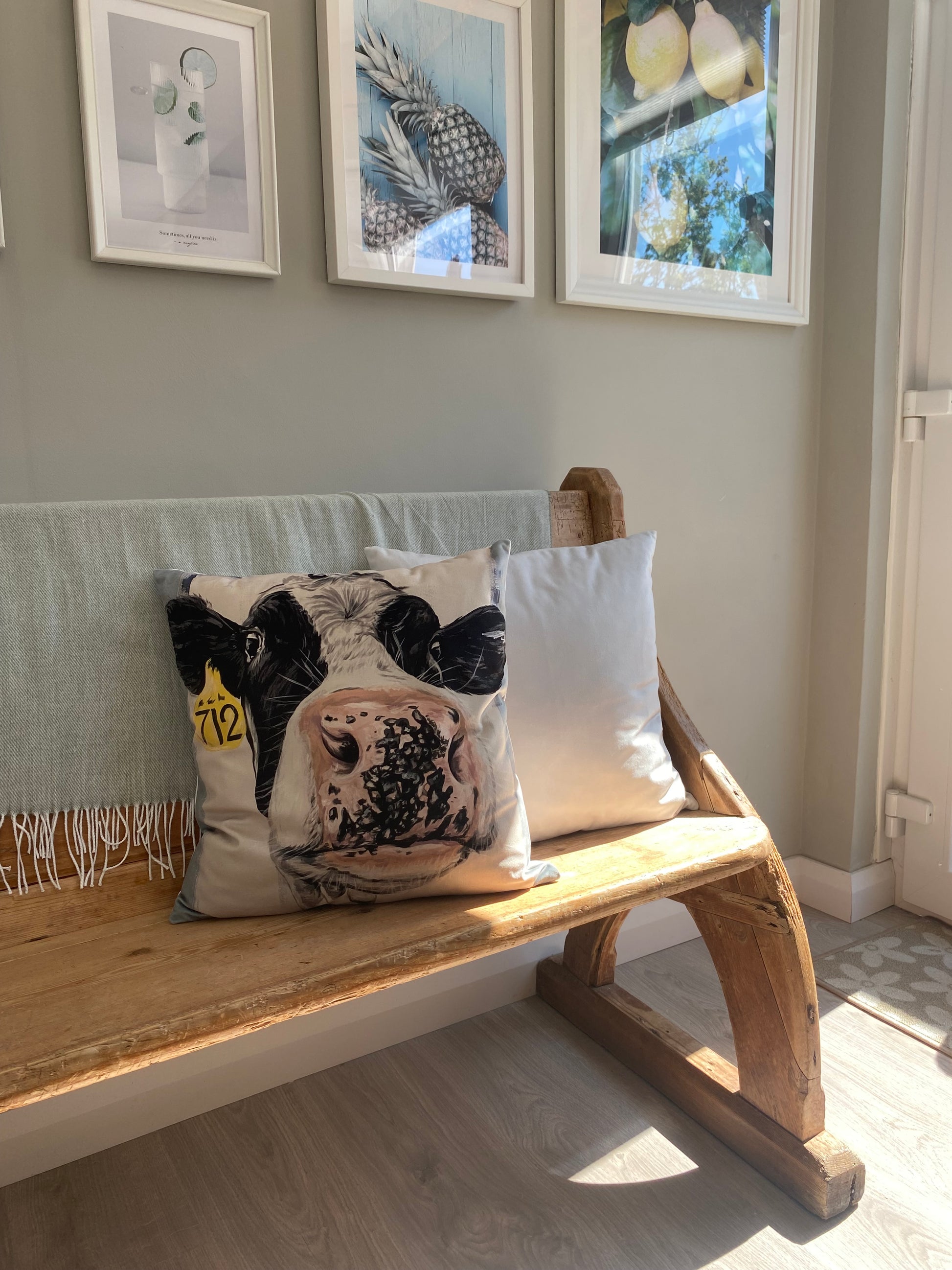 45 x 45cm cushion cover made from Artist Velour, 100% polyester fabric with concealed zip and care label. Front and back shown in picture two