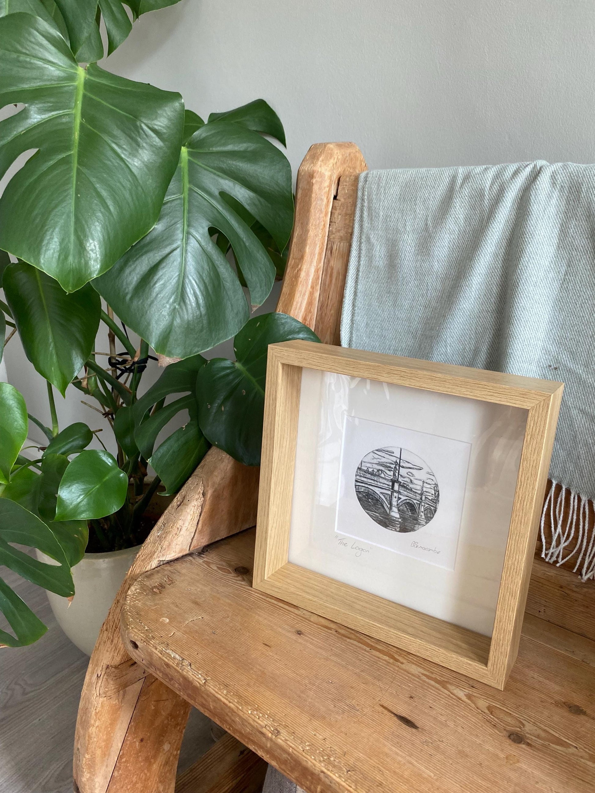 Original dry point etching prints of my travels. Mounted in a square, soft white mount. All mounts fit an IKEA Sannahed frame. Frame not included