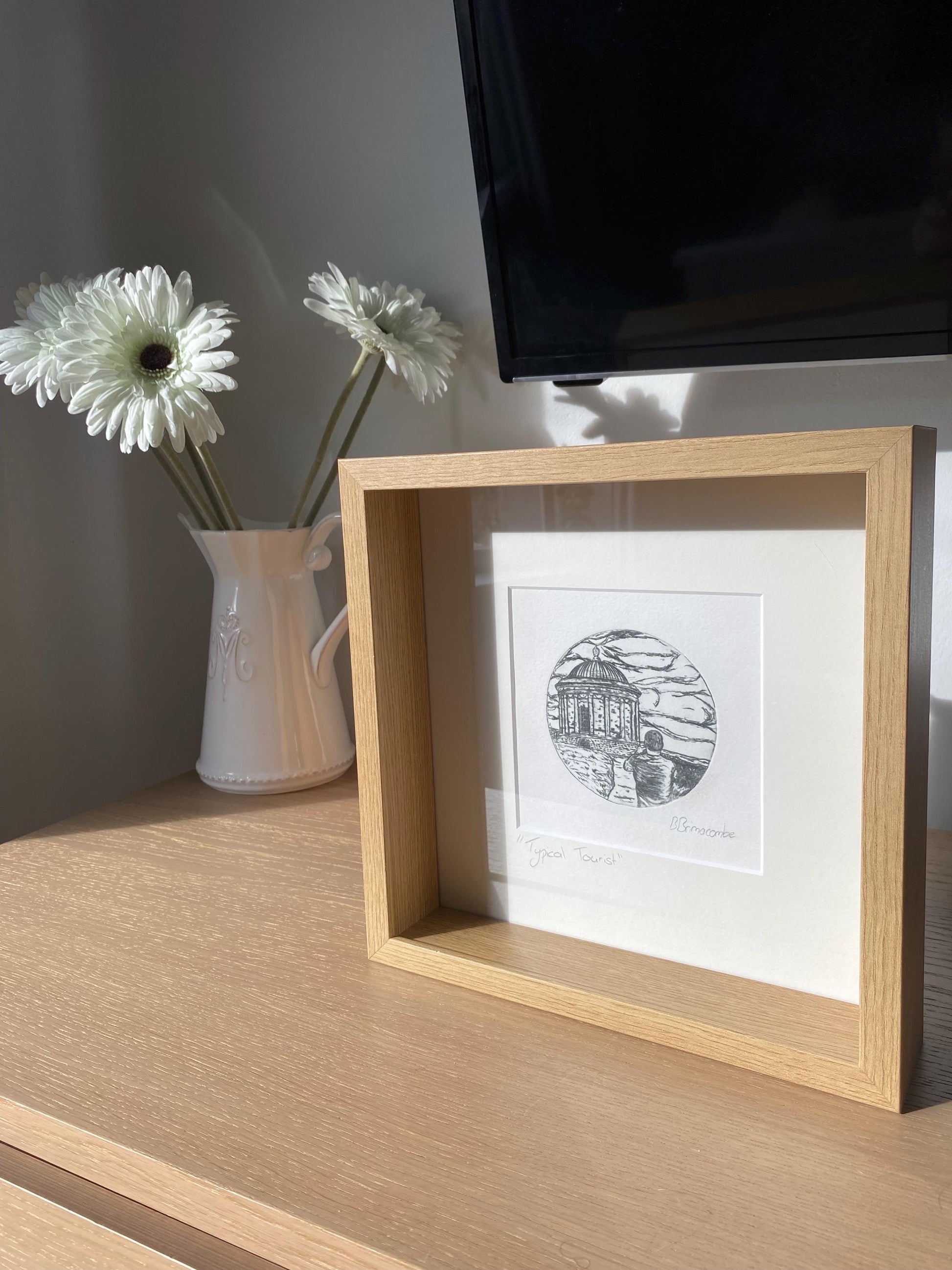 Original dry point etching prints of my travels. Mounted in a square, soft white mount. All mounts fit an IKEA Sannahed frame. Frame not included
