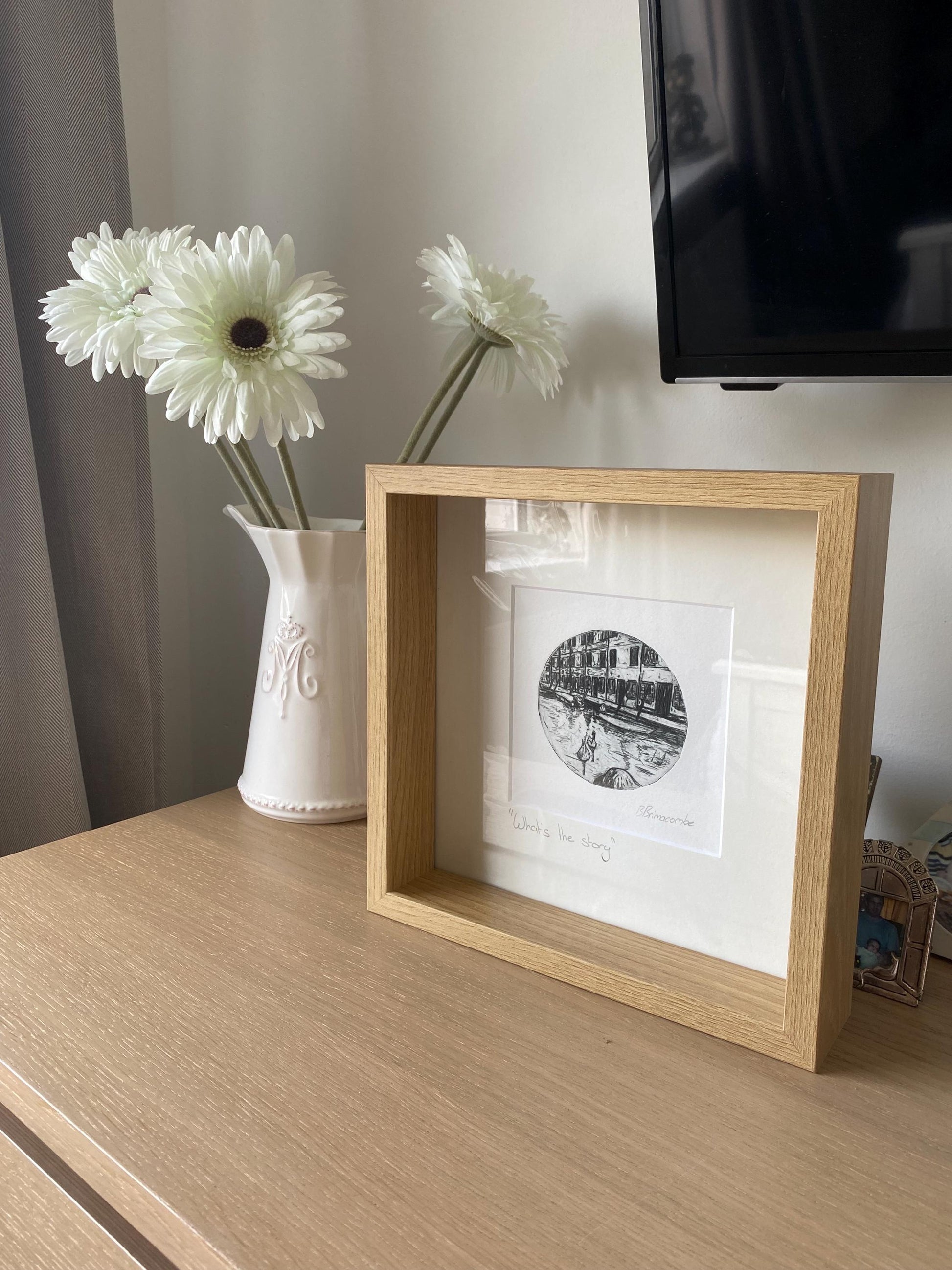 Original dry point etching prints of my travels. Mounted in a square, soft white mount. All mounts fit an IKEA Sannahed frame. Frame not included